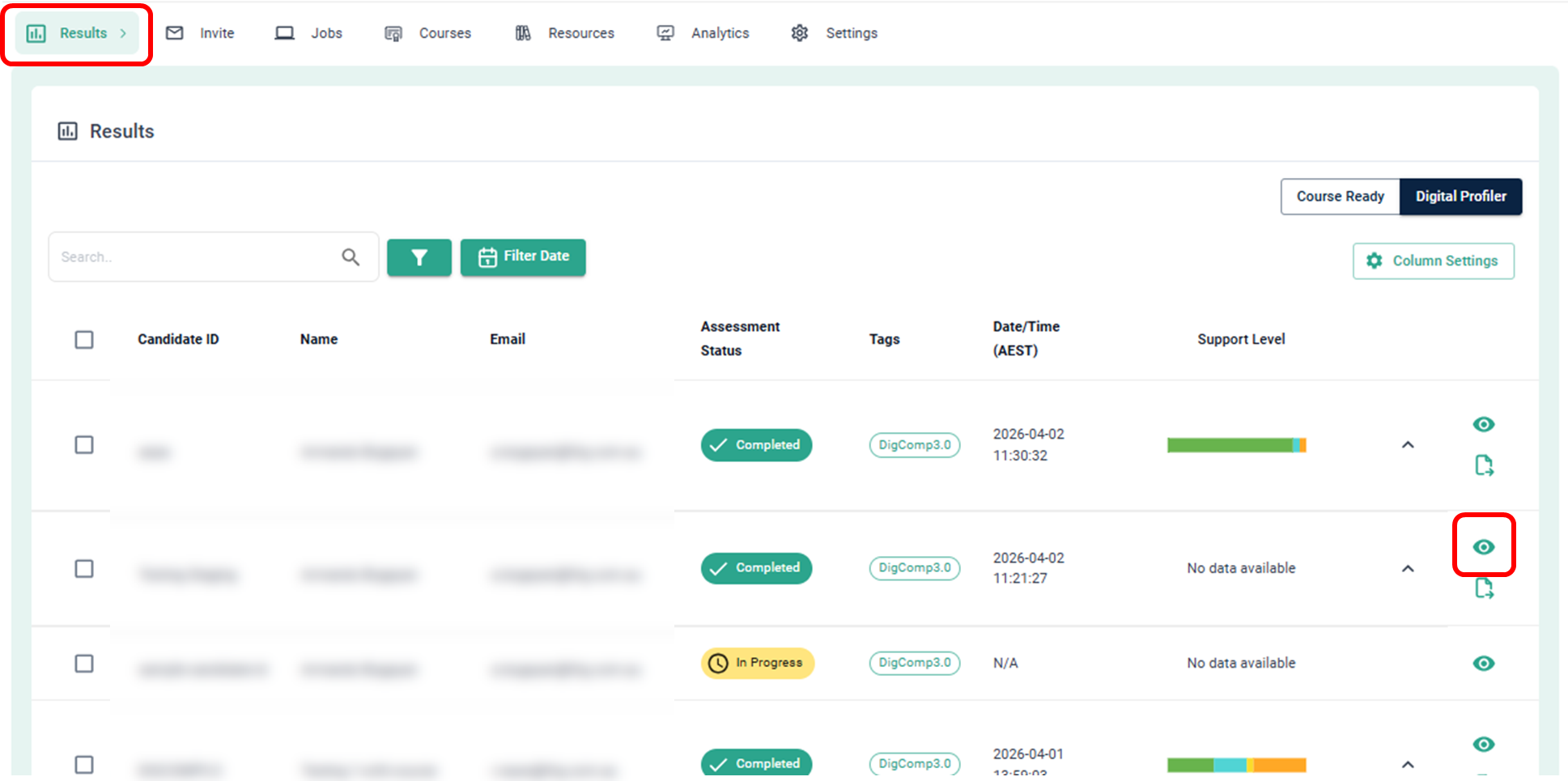 When a candidate completes the Digital Profiler questionnaire their results are saved to the Candidate Results Table. From here you can create a Digital Skills Profile that contains information about: